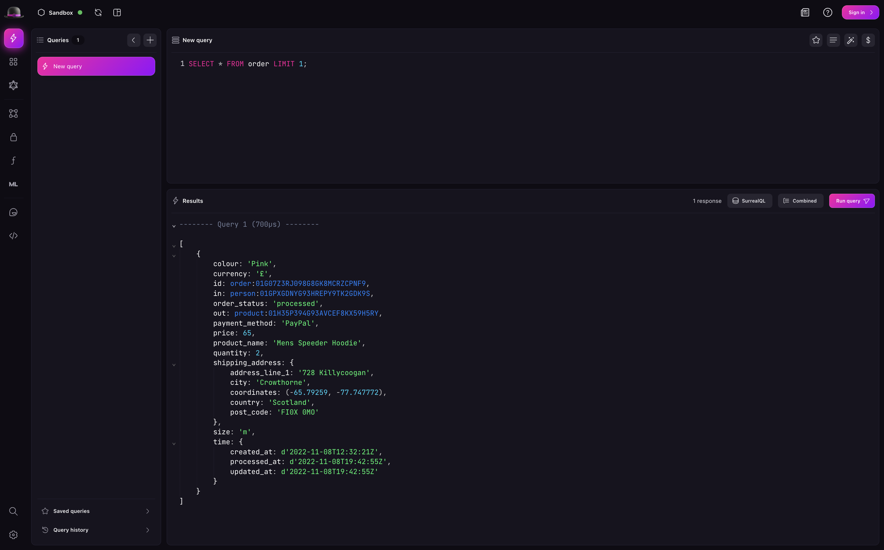 The first view you encounter when starting Surrealist is the Query view. At its core the Query view allows you to execute SurrealQL queries and view their responses, however additional features include configuring variables to use within your queries, saving queries for later use, and viewing incoming live select messages.